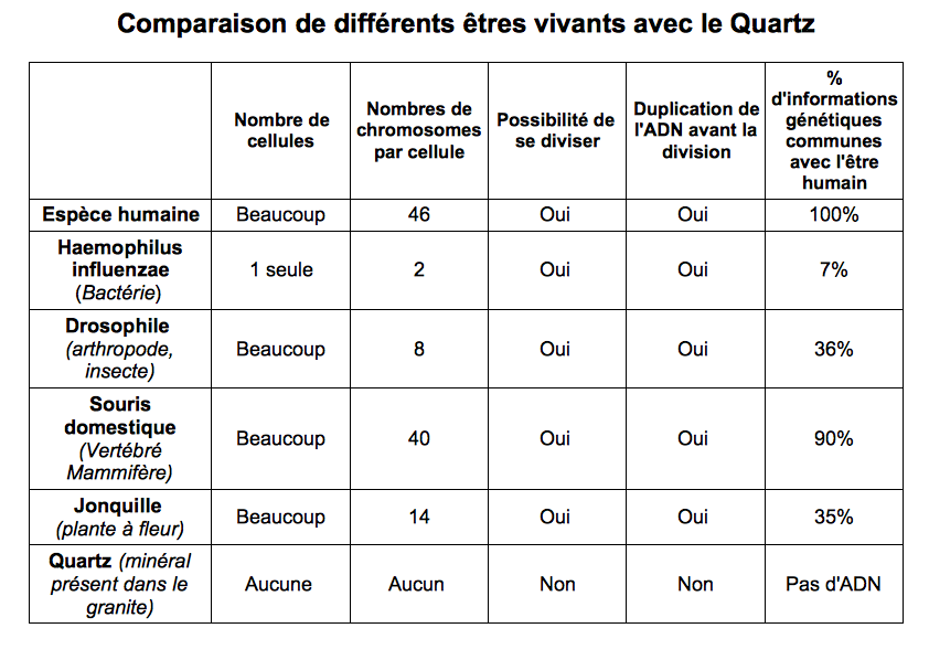 On constate beaucoup de points communs entre les différentes espèces d'êtres vivants, par contre les minéraux comme le quartz ne sont pas comparables, ils ne sont pas vivants.